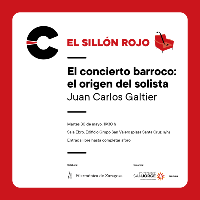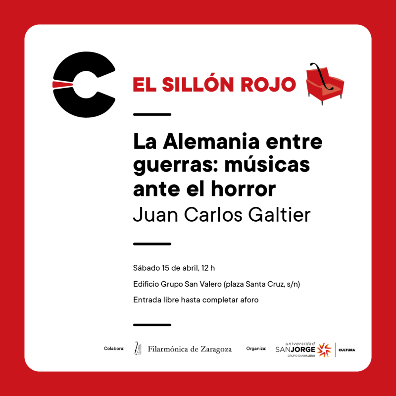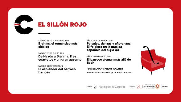 Cultura USJ, en colaboración con la Sociedad Filarmónica de Zaragoza, presenta el ciclo El sillón rojo, un interesante programa de charlas dirigidas por el crítico y divulgador musical Juan Carlos Galtier que nos acercarán al mundo de la música clásica, con especial atención a los conciertos programados por la Sociedad Filarmónica para 2023.